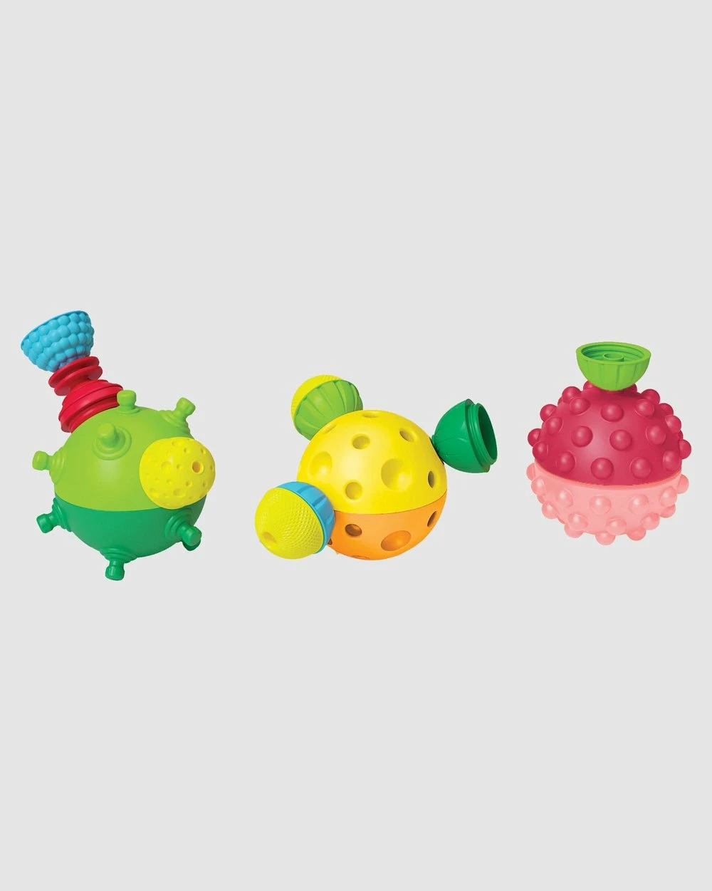The 3 sensory balls enhance sensory stimulation, gross motor skills as well as visual and perceptual skills. Sensory balls are effective in massage stimulation and heightens little one’s sensory awareness. It also comes with a 12 piece snap-together bead set to further enhance creativity. BPA free, Phthalate free, PVC free & dishwasher safe.