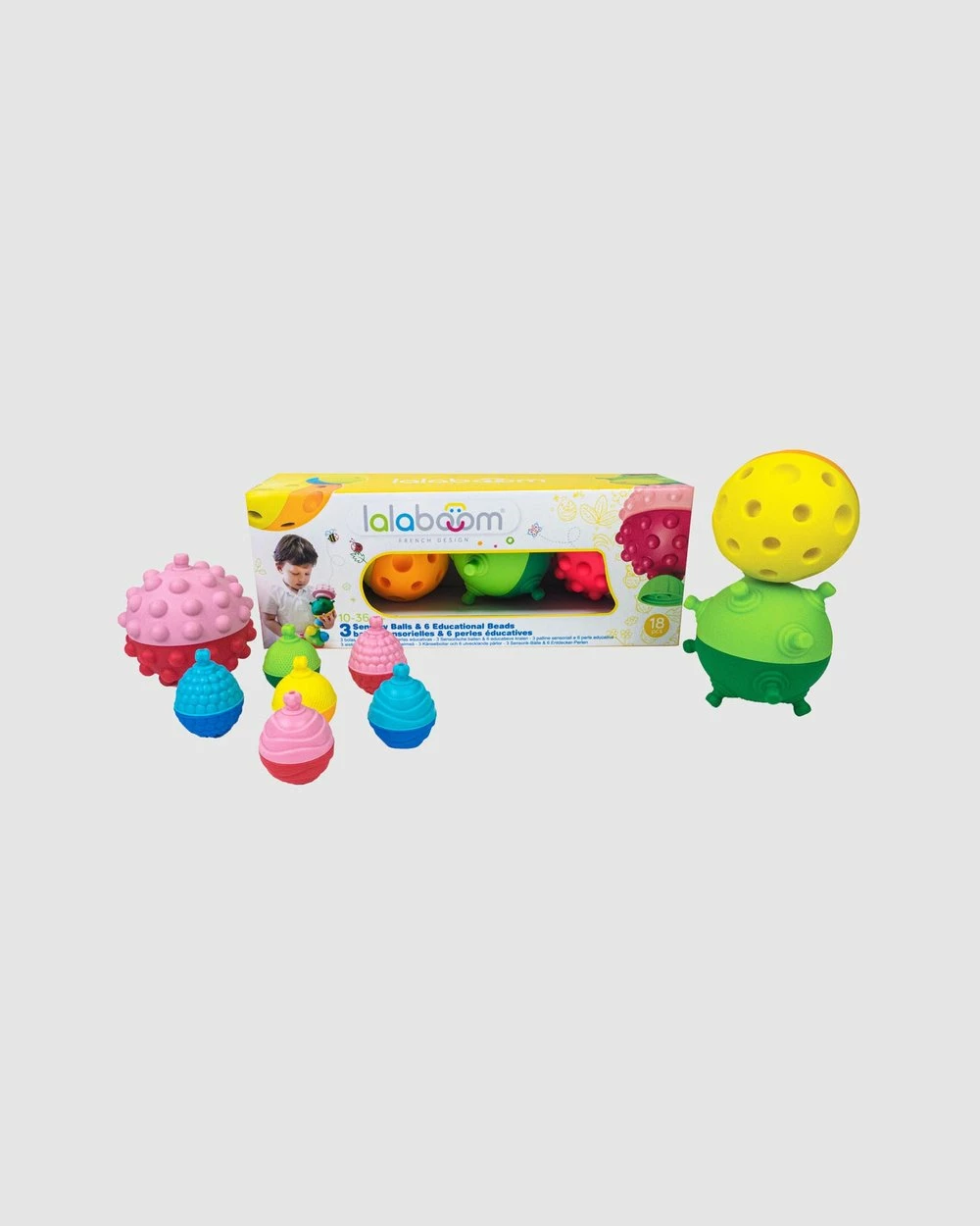 They’ll love the 3 Sensory Balls with 12 Pieces Beads by Lalaboom.