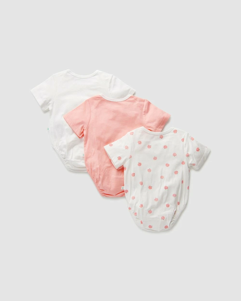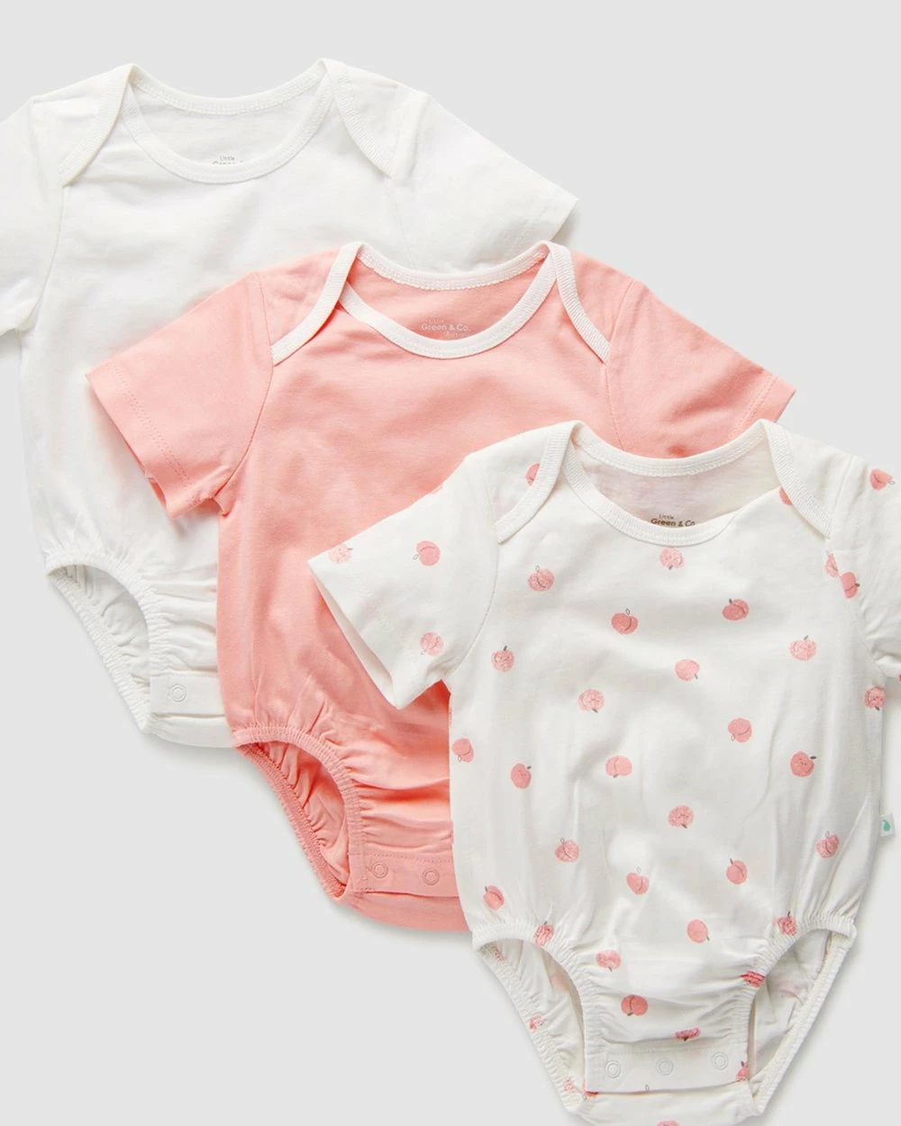 – 3x short sleeve bodysuits with an envelope neckline and inleg snap buttons for easy dressing and nappy changes