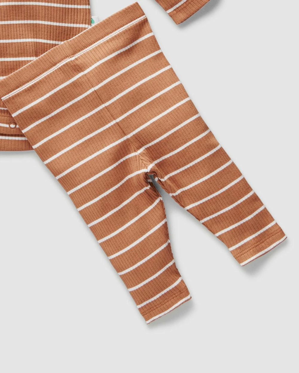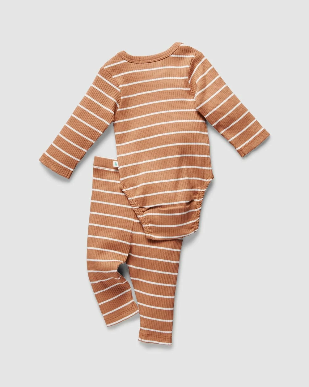 The Stripe Long Sleeve Rib Bodysuit & Leggings Set by Little Green & Co can be worn separately are layered together.