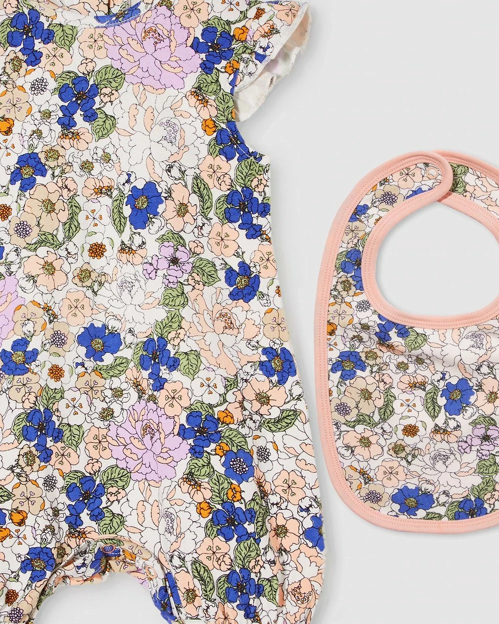 – Snap-buttoned romper nape and gusset; frill sleeves