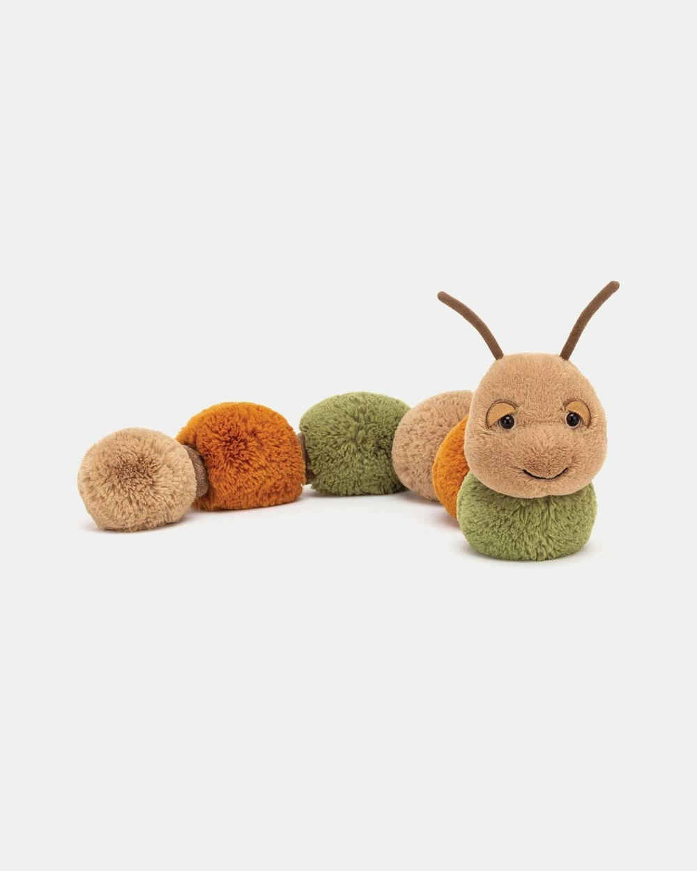 Dreamy, bobbly Figgy Caterpillar by Jellycat loves to loaf about. With beige, sage and ginger bobbles and cordy in-betweeny sections, this sleepy squiggle is garden-glam. Bumbling along with antennae wiggling, Figgy’s a pompom poppet.
