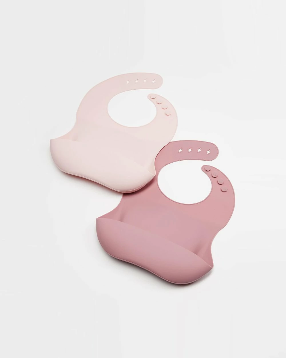 The soft and flexible 2 Pack Silicone Bibs from Bebe by Minihaha feature a wide scooped base for easy containment of messy mealtimes.