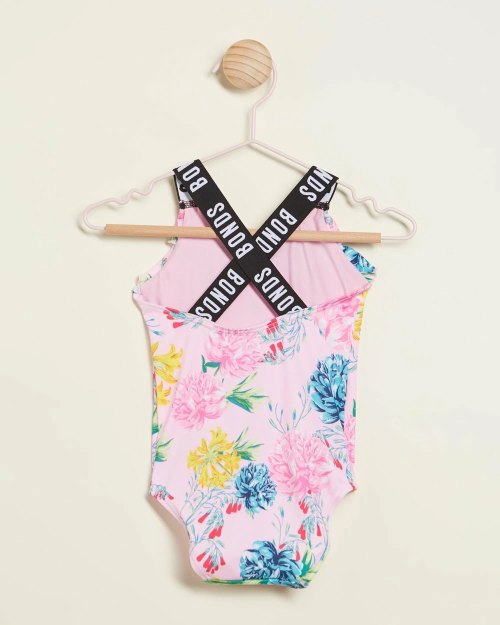 – Stretchy cross back straps with contrast branding