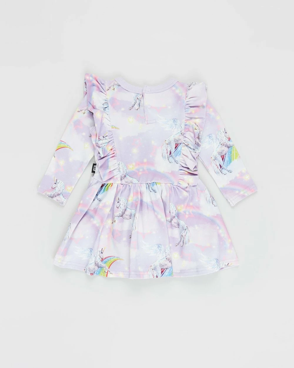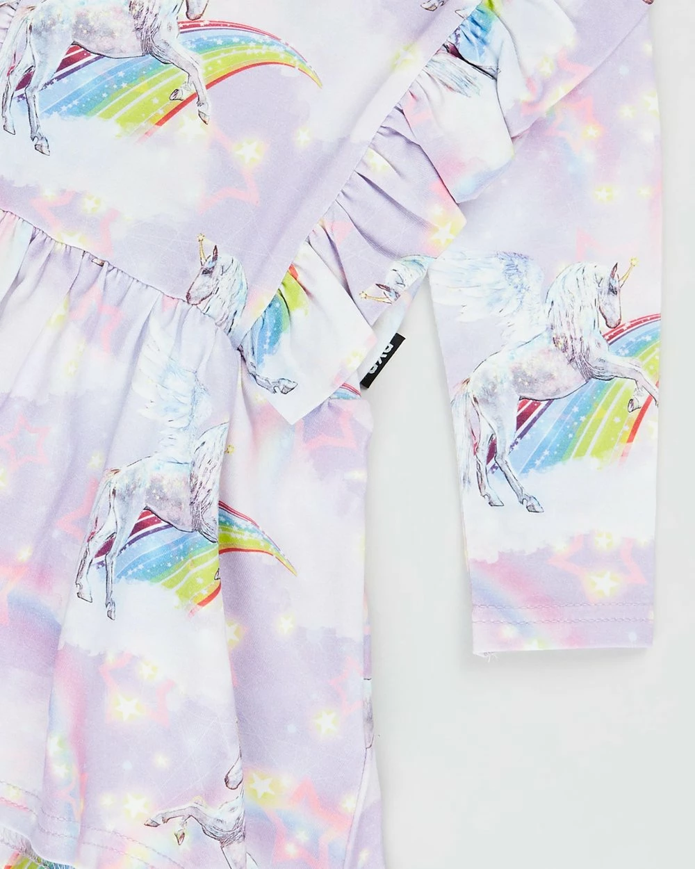 – Lilac purple base; multi-coloured unicorn and rainbow print all-over